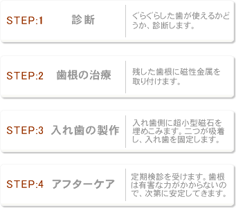 上記の入れ歯も、通常の入れ歯の治療期間とほとんど変わりません。また、治療の流れは、下記のようになります。(マグネット式の場合)